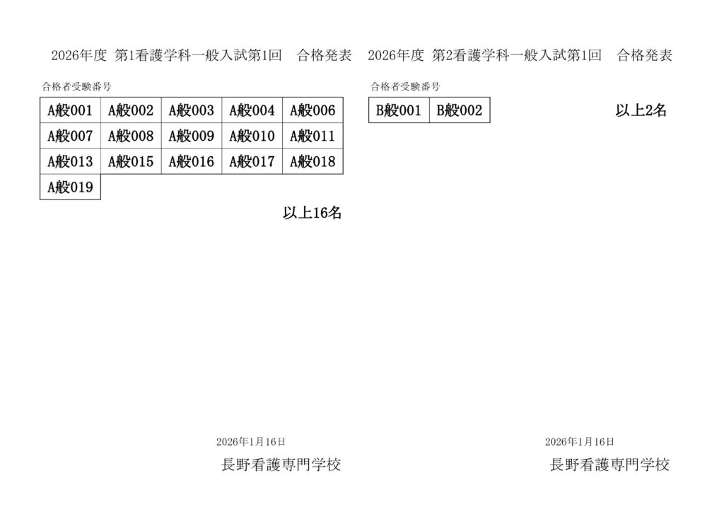 2026.01.16お知らせ 第1看護学科および第2看護学科 一般入試【第1回】合格発表 2026年1月9日(金)・10日(土)に実施した標記入学試験の合格者番号は下記のとおりです。合格者には本日、入学手続き書類を郵送させていただきます。 一覧へ戻る
