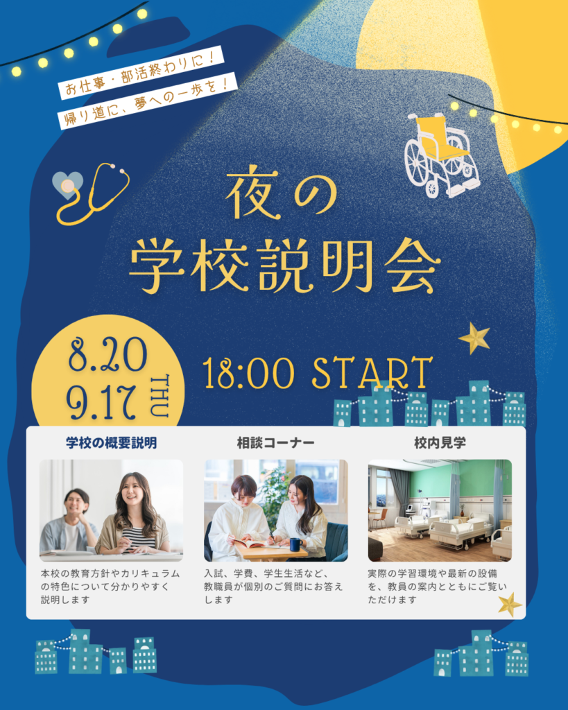 お仕事や学校帰りでも参加しやすい「夜間説明会」と、在校生との交流が楽しめる「土曜昼間の説明会」をご用意しました。あなたのライフスタイルに合わせて、ぜひお気軽にご参加ください!
